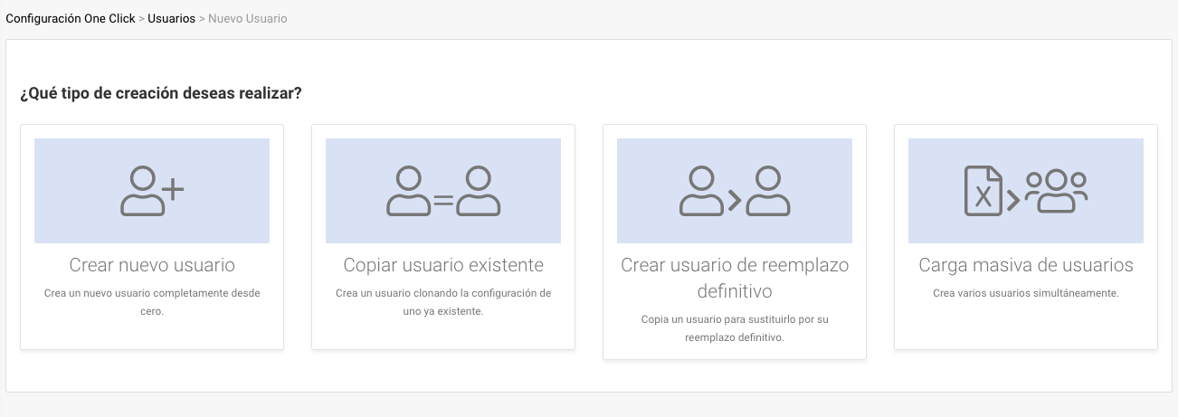 Desde hoy con Configuración One Click podrás crear usuarios de forma rápida y eficiente, para lo cuál hemos dispuesto una nueva funcionalidad que permite crear usuarios de forma masiva. Actualmente a través de Configuración One Click solamente puedes crear un usuario a la vez, para luego asignar los permisos correspondientes.
